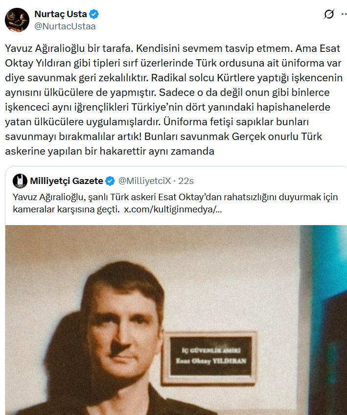 Usta, Yavuz Ağıralioğlu bir tarafa. Kendisini sevmem tasvip etmem. Ama Esat Oktay Yıldıran gibi tipleri sırf üzerlerinde Türk ordusuna ait üniforma var diye savunmak geri zekalılıktır. Radikal solcu Kürtlere yaptığı işkencenin aynısını ülkücülere de yapmıştır. Sadece o da değil onun gibi binlerce işkenceci aynı iğrençlikleri Türkiye’nin dört yanındaki hapishanelerde yatan Ülkücülere uygulamışlardır. Üniforma fetişi sapıklar bunları savunmayı bırakmalılar artık! Bunları savunmak Gerçek onurlu Türk askerine yapılan bir hakarettir aynı zamanda” ifadelerini kullandı.
